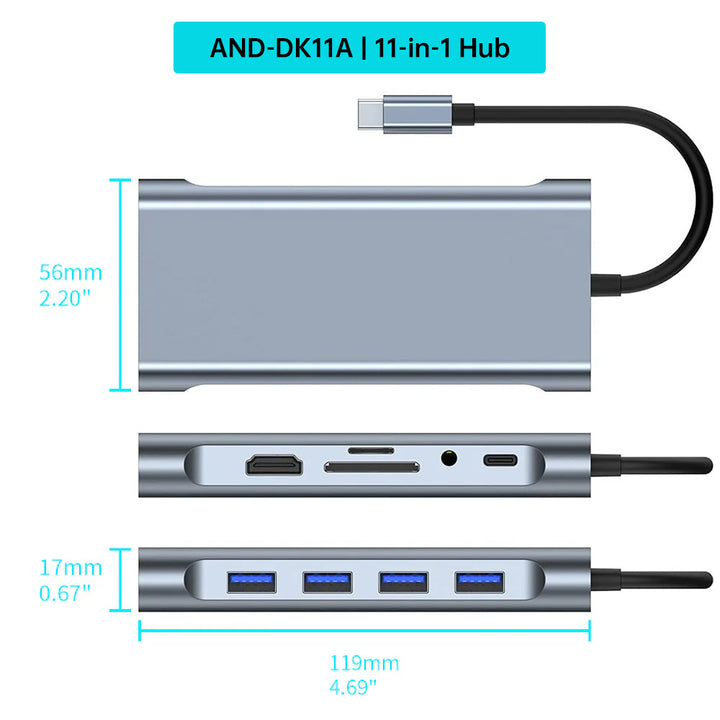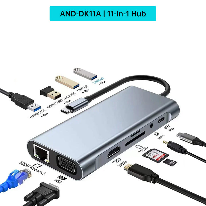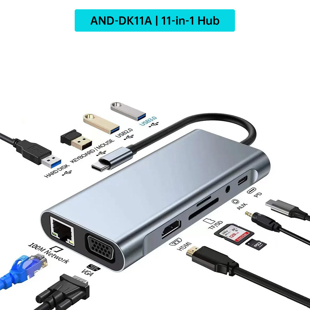AND-DK11A | 11-in-1 Hub | USB (3.0) + 3 USB (2.0) + Ethernet (RJ45) + VGA (1080P) + HDMI (4K) + TF + SD + Audio (3.5mm) + TYPE-C (PD)