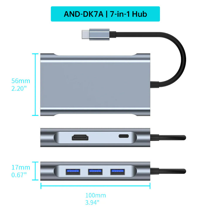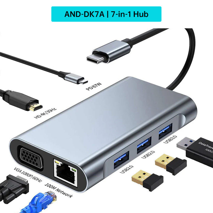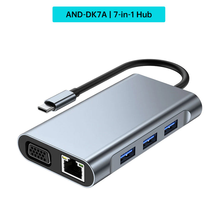 AND-DK7A | 7-in-1 Hub | TYPE-C (PD) + HDMI (4K) + VGA (1080P) + Ethernet (RJ45) + 2 USB (2.0) + USB (3.0)