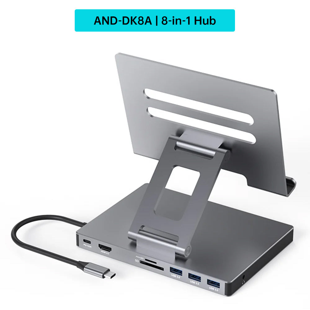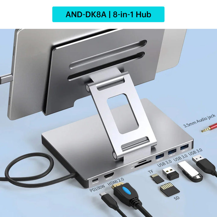 AND-DK8A | 8-in-1 Hub with Foldable Stand | TYPE-C (PD) + HDMI (4K) + TF + SD + 3 USB (3.0)+ Audio (3.5mm)