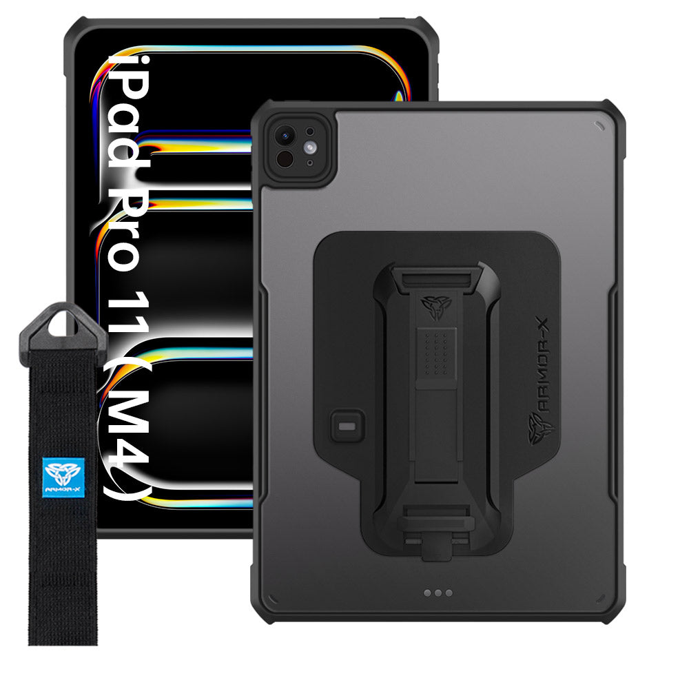 ARMOR-X iPad Pro 11 ( M4 ) shockproof case, impact protection cover with hand strap and kick stand. One-handed design for your workplace.