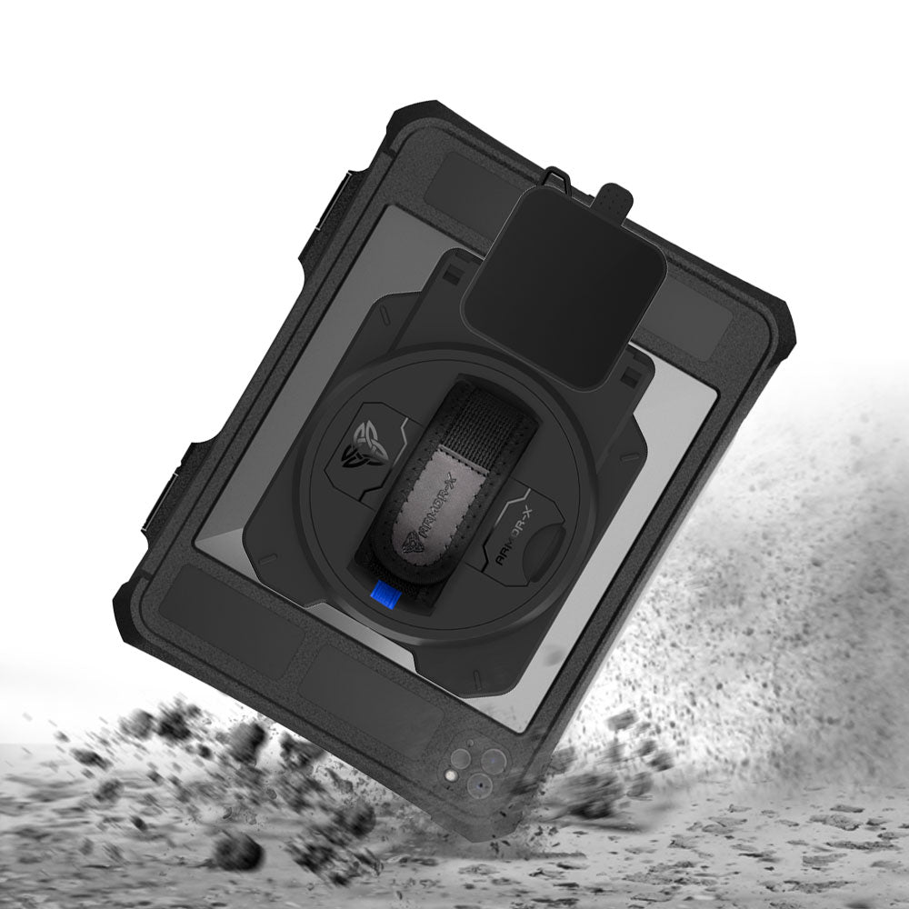 Our protective case comes with a built-in hand strap, kick-stand and X-DOCK interface. It provides the best functionality for our end user to use their tablet securely.