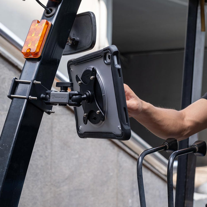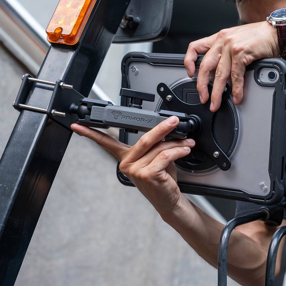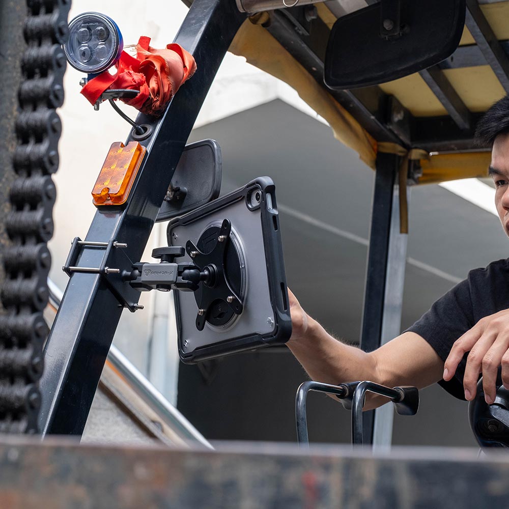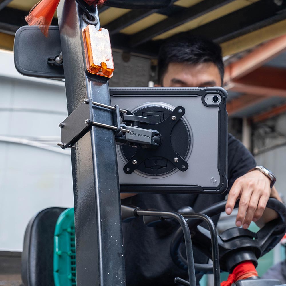 • Durable enough to withstand the toughest warehouse environments, this heavy-duty forklift phone mount is ideal for material handling environments such as fulfillment centers, warehouses, or factories. The ARMOR-X ONE-LOCK Forklift Pillar Mount is great for mounting and securing a phone to any warehouse vehicle and keeping it within reach.