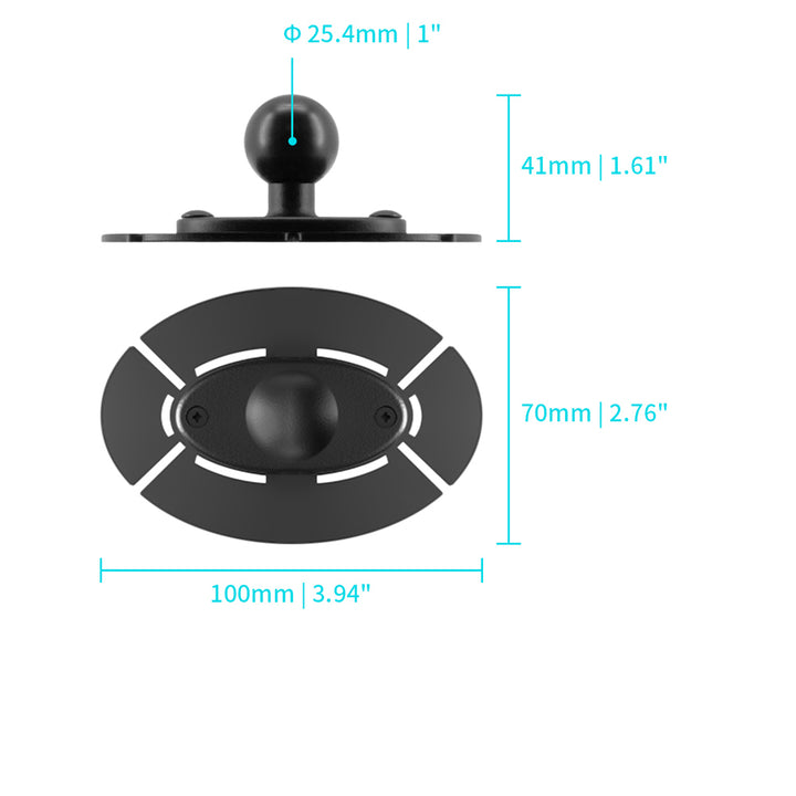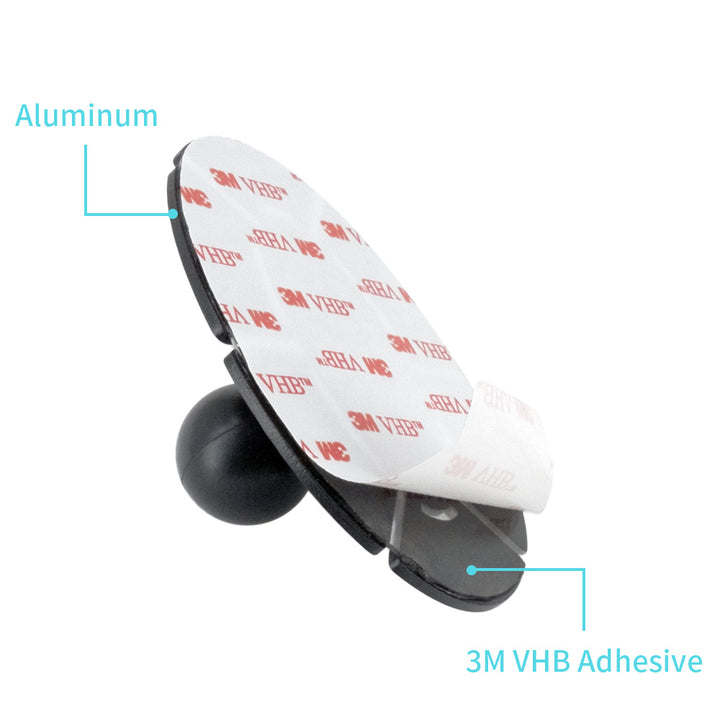 • Simply remove the white plastic from the back of the 3M VHB adhesive oval mount base, then place and press down on a previously cleaned surface. (Allow a minimum of 24 hours for a full cure.)
