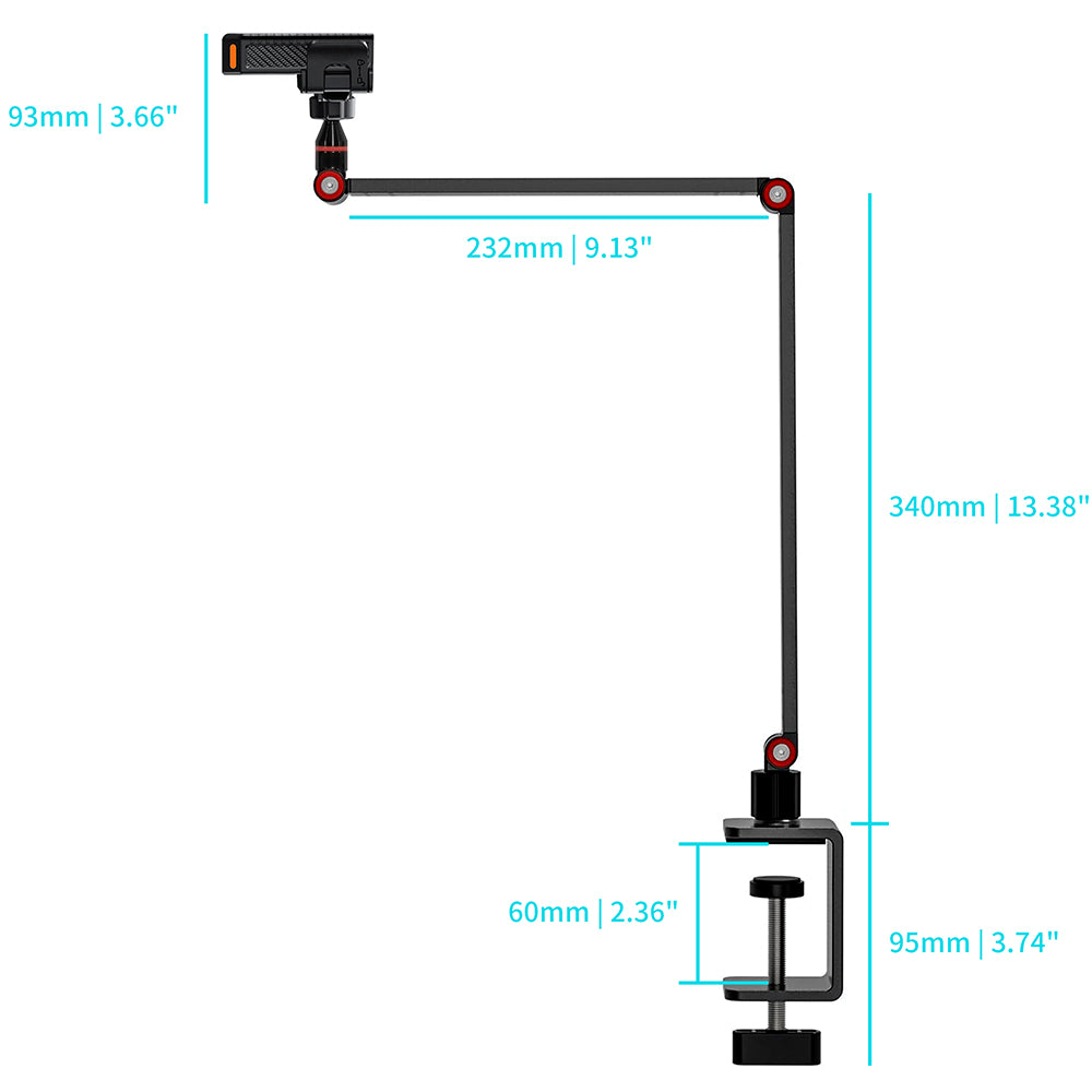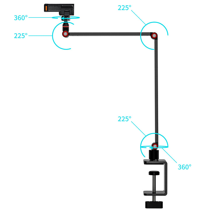• The clamp mount has 5 rotatable joints (3x225°, 2x360°), you just need to loosen the screws with Allen key, adjust the position and angle and height, and then tighten the screws.
